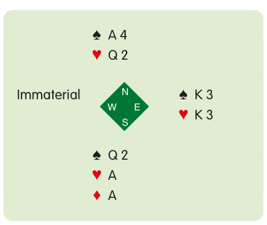 South leads the A and discards the ♠4 from dummy. Both the hearts and spades are now blocked but South can unblock whichever suit East discards and use the other suit as an entry to the then established queen.