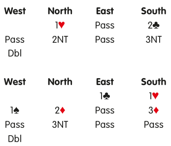 On the first auction, East would be likely to lead a spade or a diamond without the double. On the second auction, East would be likely to lead a spade without the double.