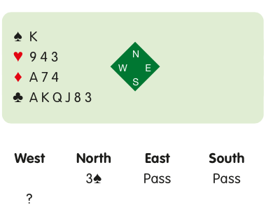 The options here are 3NT, 4♣ and double. Although you do not have a certain spade stopper, you need far less help from partner to make 3NT than 5♣ or 4. In any case, North is most unlikely to lead the ♠A. Bid 3NT.