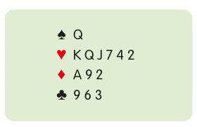 Suppose you lead the ♥K, losing to the ♥A. On the second round of spades, you can discard a high diamond, the nine, to encourage diamonds, or a low club, the three, to discourage clubs.